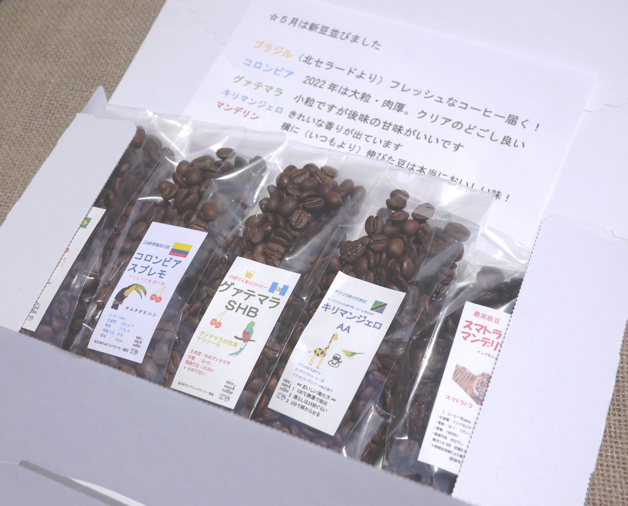【5産地】ブラジル・コロンビア・グァテマラ・キリマンジェロ・マンデリン各50g_豆または粉(送料込み)